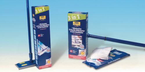 Floor wiping system: Holder with pressure cell system and premium telescopic / plug-and-turn handle 10 Wet floor cloths and 10 anti dust cloths with microfibres for perfect cleaning results